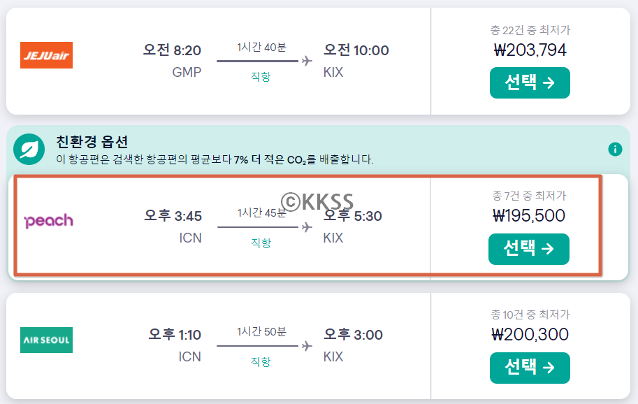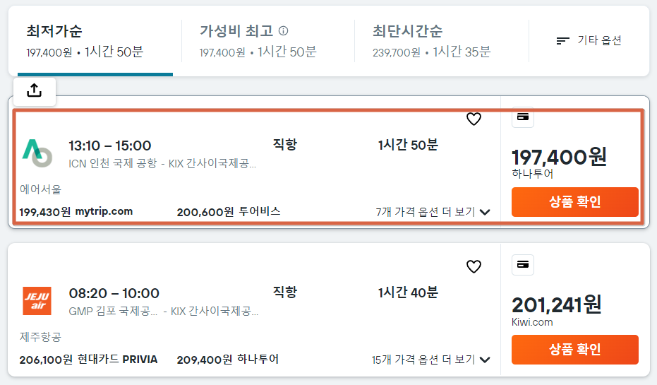 항공권 가격비교 사이트 카약은 에어서울 항공을 이용하면 오사카에 제일 저렴하게 갈 수 있다고 나옵니다. 가격비교가 네이버 항공권과 같네요.